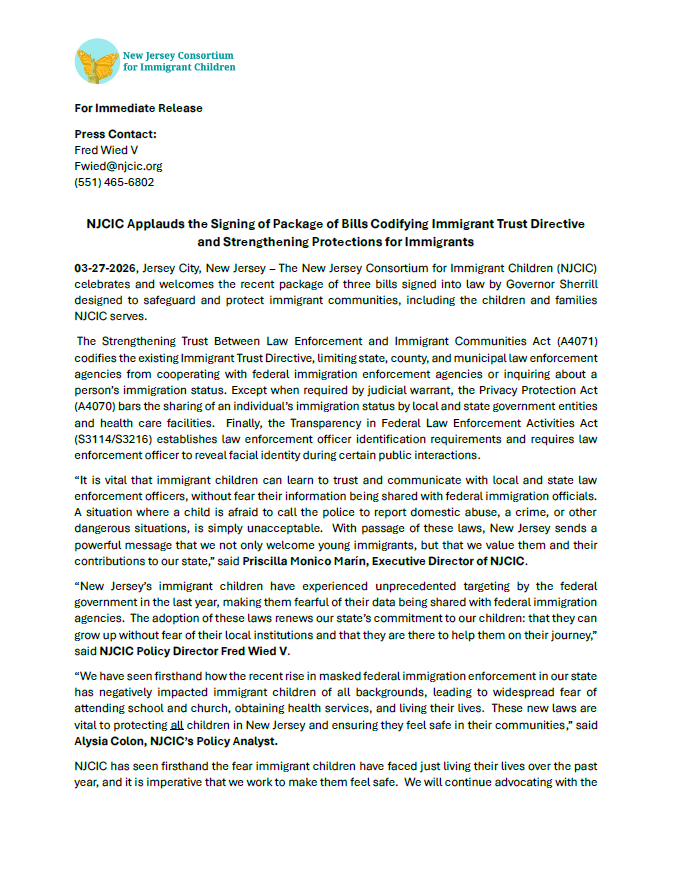 March 27, 2026, Jersey City, New Jersey – The New Jersey Consortium for Immigrant Children (NJCIC) celebrates and welcomes the recent package of three bills signed into law by Governor Sherrill designed to safeguard and protect immigrant communities, including the children and families NJCIC serves.