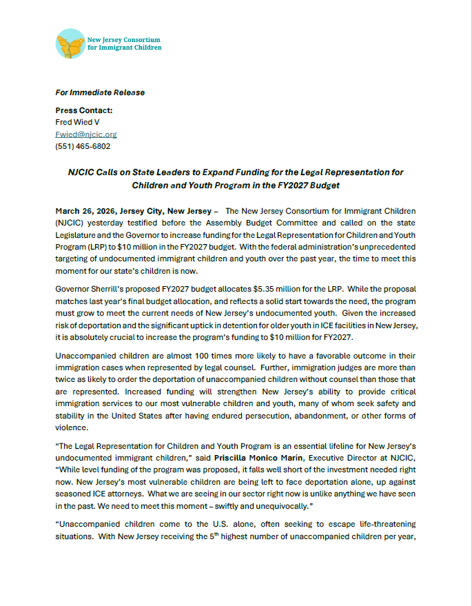 March 26, 2026, Jersey City, New Jersey – The New Jersey Consortium for Immigrant Children (NJCIC) yesterday testified before the Assembly Budget Committee and called on the state Legislature and the Governor to increase funding for the Legal Representation for Children and Youth Program (LRP) to $10 million in the FY2027 budget. With the federal administration’s unprecedented targeting of undocumented immigrant children and youth over the past year, the time to meet this moment for our state’s children is now.